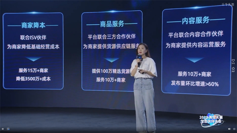 在生態伙伴大會上,會議陸續從“共贏、引領、見證”的關鍵詞出發,探討了淘寶天貓開放生態的新方向與新策略,并結合未來趨勢分享了淘寶小程序的新賽道與新機會。淘寶天貓商家服務與服務市場負責人南蘭提出電商服務已經進入“精細化時代”,希望代運營服務商都可以參與到內容化的場景服務中。后續圓桌對話也將服務商的價值與機遇作為主要議題。