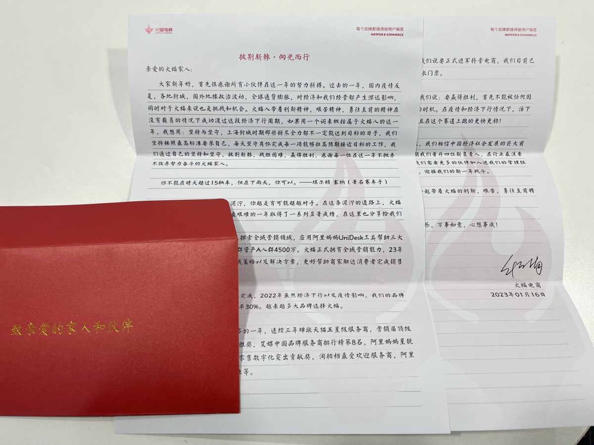 隨著新春的臨近,一整年的工作逐漸進入尾聲,火蝠電商向所有員工下發了新春賀禮年貨禮盒,同時也送上了火蝠電商CEO鐘雨清親自書寫的家書一封,千字篇語皆是直抒胸臆的真情實感。