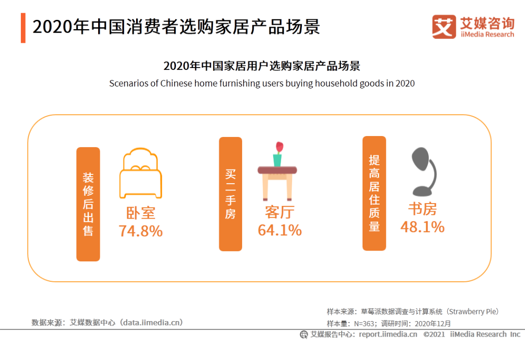 調(diào)查顯示,2020年,中國家居用戶選購家居產(chǎn)品場景分布中,“裝修后出售”為臥室購買家居產(chǎn)品的占比最高,為74.8%;裝修原因為“買二手房”中,為客廳購買家居產(chǎn)品的占比最高,為64.1%;為“提高居住質(zhì)量”而為書房購買家居產(chǎn)品在各場景中占比最高,為48.1%。臥室作為人們進(jìn)行睡眠放松的場所,勢必成為家居用戶“裝修后出售”而購買家居產(chǎn)品的首選。