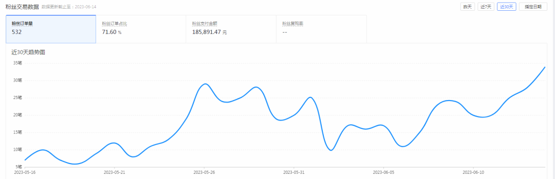 目前,粉絲訂單占比71.6%,粉絲復(fù)購率在5.33%左右??恐托暮图?xì)心,將售前與售后配合起來,店鋪在數(shù)據(jù)呈現(xiàn)上,減少了20%的售后率,也積攢了來之不易的口碑。